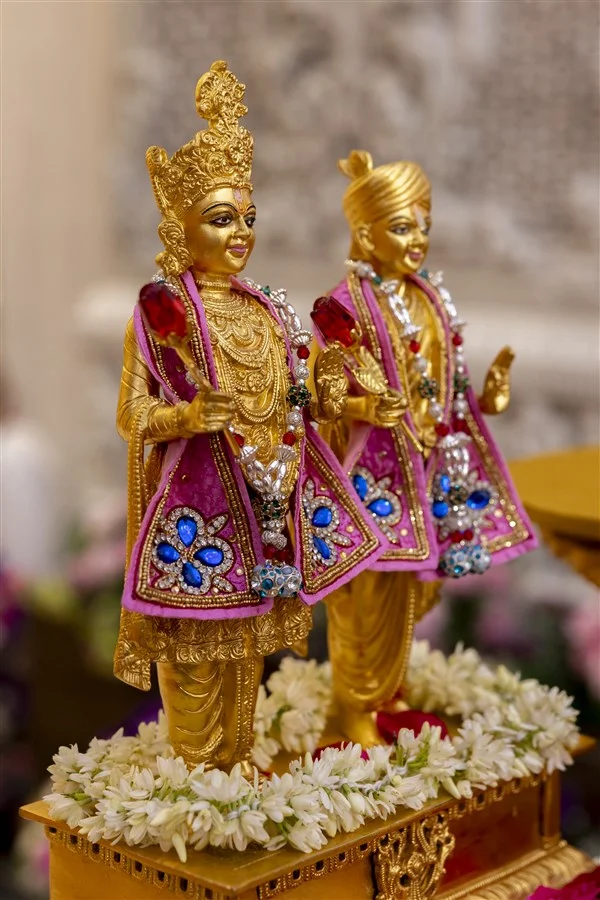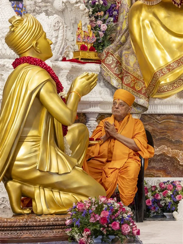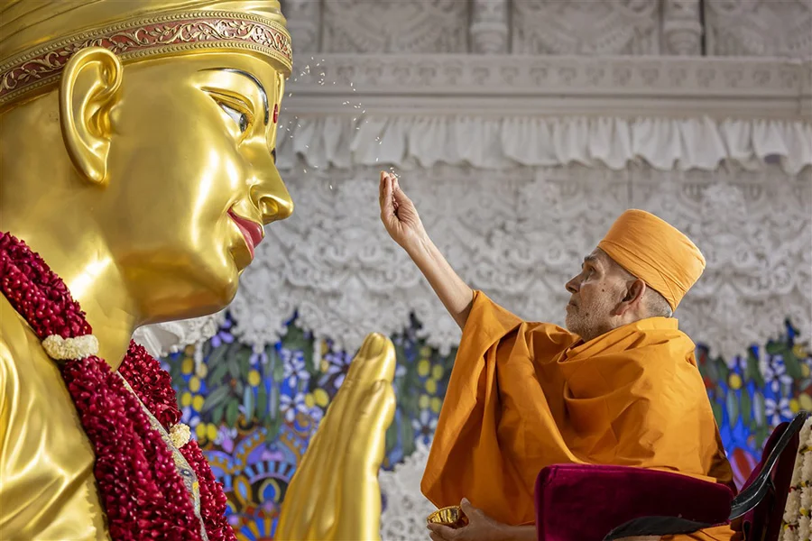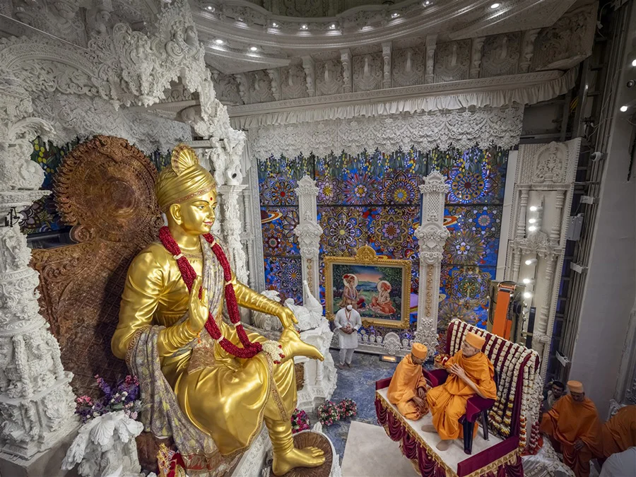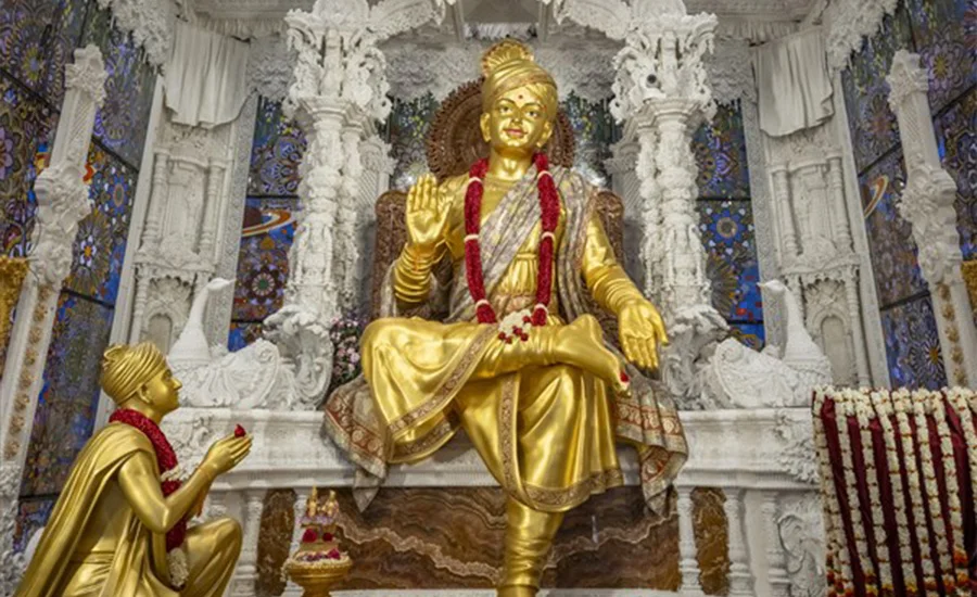 Les sculptures du temple d'Akshardham peuvent être décrites comme une « histoire de la civilisation hindoue gravée dans la pierre ». De la statue géante de Bhagwan Swaminarayan, chef spirituel hindou du XIXe siècle, vénérée dans le hall principal, à la statue en bronze de Nilkanth Varni, haute de 15 mètres, à l'entrée du parc, chaque statue véhicule des récits religieux et des symboles culturels. Par exemple, la statue de Nilkanth Varni se tient sur un pied, la plante du pied tournée vers le haut, dans une posture de yoga, recréant le voyage ascétique de 13 000 kilomètres du saint, de 1792 à 1799, qui dura sept ans. Ses détails dynamiques et ses implications religieuses sont figés à jamais dans la texture du cuivre.